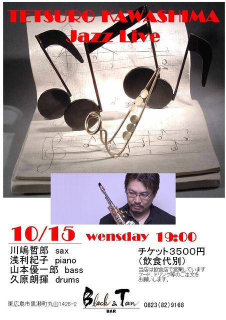 10月15日 水曜日 19:00〜 「川嶋哲郎ジャズライブ」 スイングジャーナル誌の人気投票 「テナーサックス部門」で5年連続1位に輝く 名実共に日本ジャズ界を代表する奏者 川嶋哲郎さんのライブです。 今回共演してくださるのは、 地元広島で活躍されておられる 浅利さん(p)、山本さん(b)、久原さん(dr)、 の方々です、ご期待下さい。 ミュージックチャージ3500円 (飲食代別) 東広島市黒瀬町丸山 1426−2 ジャズバー 「Black&T