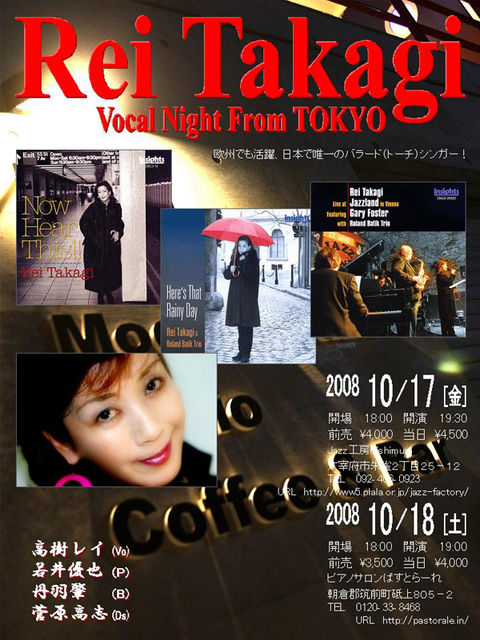 Jazz工房Nishimuraがお贈りしますライブ、第24弾。 「高樹レイ With 若井優也トリオ From TOKYO」 魅惑のボーカリスト、高樹レイ、西日本・九州ツアー、東京よりの登場です。 日本を代表するトーチシンガー。 そのバラードは、暖かく大きく語り心の奥底に訴えかける、 そして楽しい曲は本当に楽しく歌い上げる。 特にバラードなどは、日本人離れしたグレード・レベル共に高いボーカルとして評価されています。 素敵なエンターテイメントがあって聴く者を大いに楽しませひき込んでいくスケールの大きい歌です。 一方、ピアニストは若