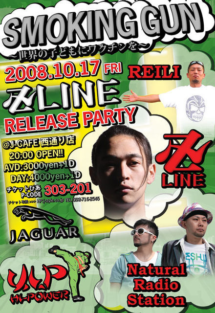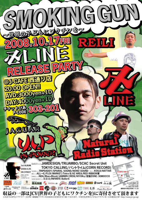 管理人様、告知失礼します。 SMOKING GUN 〜世界の子どもにワクチンを〜 卍LINE Release Party 2008/10/17(FRI) 20:00-5:00 @J-CAFE西通り店 AVD:3000yen+1D DAY:4000yen+1D チケット取扱>>> ?チケットぴあP-CODE303-201 ?J-CAFE西通り店 http://www.j-style.co.jp/ 092-716-2545 福岡市中央区天神2-4-29 ?NoN SuGarまでメール下さい SPECIAL GUEST>>> 卍LINE REILI V.I.P HI-POWER Natural Radio Station GUEST>>> JA