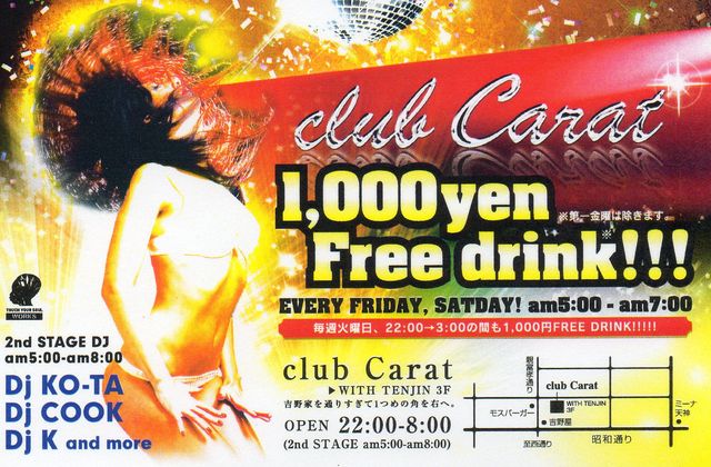管理人様、告知させていただきます @club Carat [WITH TENJIN BLD 3F 地下glaf] さあ 恒例の金曜、土曜の\1000FREE DRINK NIGHT まだまだ夜は終わらない 2nd Carat START 5:00〜7:00 (7時まで飲み放題!!) CLOSE 8:00 DJ's DJ DAIZO DJ ko-ta DJ K 今夜もCaratでお待ちしております