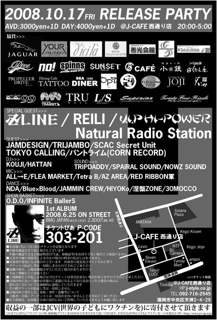 管理人様、告知失礼します。 SMOKING GUN 〜世界の子どもにワクチンを〜 卍LINE Release Party 2008/10/17(FRI) 20:00-5:00 @J-CAFE西通り店 AVD:3000yen+1D DAY:4000yen+1D チケット取扱>>> ?チケットぴあP-CODE303-201 ?J-CAFE西通り店 http://www.j-style.co.jp/ 092-716-2545 福岡市中央区天神2-4-29 SPECIAL GUEST>>> 卍LINE/ REILI/ V.I.P HI-POWER/ Natural Radio Station GUEST>>> JAMDESIGN/TRIJAMBO/SCAC Secre