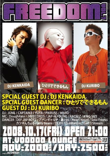 告知失礼します!!! FREEDOM SP 2008.10.17(FRI)21:00〜 @Voodoo Lounge ADV:2000 DAY:2500 SP GUEST DANDER:ひとりでできるもん SP GUEST DJ:DJ KENKAIDA / DJ KURIBO その他にも福岡を代表するDJ/MC/DANCERが大集合します!!! 詳細はまたのせるんでチェックしてください!!!
