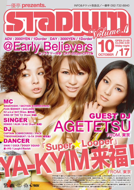福岡にYA-KYIMが上陸します!!! 《STADIUM》九州TOUR'08 ■日時:2008年10月17日(金)START 22:00〜 ■会場:EARLY BELIBERS(福岡) ■料金:前売り2,000円/当日3,000円 ※ドリンク代別途¥500 (ライヤー持参¥500 OFF) 〈SPECIAL GESUT〉 YA-KYIM from 東京 DJ AGETETSU from 東京 〈MC〉 MASATOSHI/SECTION 8(38RECORDS)/JAP-H/GULLDOG/FLEA MARKET KZ a.k.a 441(from鹿児島)/KING OF THE13(from沖縄) 〈SINGER〉 ALIA/KENGO/D-AI(from長崎) 〈DANCER〉 碁=YO/COCA/OR/Suger Musium/SHIKI 〈D
