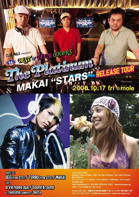 今回はmoleがOPENした年以来のGTSの登場デス。BESTアルバムBEST OF HOUSE COVERS-ThePlatinum-が発売され既にチェックしてる方多数ですが、リリースツアー開催です。今回は9月24日にアルバム“STARS”をリリースした今、大注目のDJ MAKAI、ステキな笑顔と歌声が札幌のHOUSEフリークをはじめ多くのリスナーを魅了してやまないarvin homa aya、そして札幌から飛び出した新星Sound Aroundと豪華メンバーでお送りする一夜デス!!!新旧入り交ざったハウスフェスティバルに