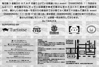 告知失礼します!!! 【DIAMONDS−Vol'22】 2008.10.17(Fri) @F.A.P ■F.A.P.公式WEBサイト http://www.club-fap.com ■F.A.P.藤沢朝日町パラダイス地図です。 http://mixi.jp/view_bbs.pl?id=8282201&comm_id=246043 ◆DIAMONDS@F.A.P(MIXI コミュ) http://mixi.jp/view_community.pl?id=3382504 ◆赤提灯 de ないと (DJ TAKUYAのBLOG) http://djtakuya.blog.shinobi.jp ☆HIPHOP,R&B,REGGA