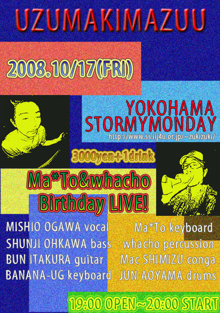オレ様とマット様の生誕記念ライブです。 一世一代の演奏をお目にかけましょう。 ぼーっとしてるかもしれないけど(笑) ウズマキマズウ Ma*To (synth) whacho (toycussion) 小川美潮 (vocal) 大川俊司 (bass) 板倉文 (guitar) banana-UG (keyboard) MAC 清水 (percussion) 青山純 (drums) 19:00 OPEN 20:00 START チャージ3,000円+One Drink 横浜ストーミ−マンディ http://www.ss.iij4u.or.jp/~zukizuki/