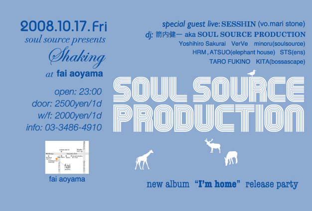 管理人様 告知失礼いたします。 SOUL SOURCE PRODUCTION こと箭内健一のニューアルバム -I'm home- のリリースパーティーが青山ファイにて開催決定!! http://www.soulsource.jp/ 今回はアルバムにもフューチャリングしたボーカル mari stone のバンド編成ライブもあります!! 2008.10.17(fri) Shaking SOUL SOURCE PRODUCTION 3rd album -I'm home- Release party @fai aoyama http://www.fai-aoyama.com/ open: 23:00 door:2500/1D w/f:2000/1D -MAIN FLOOR- <GUEST LIVE> SESSHIN