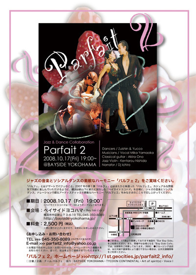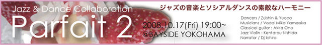 食欲の秋ですが、 アーティスティックなパルフェを召し上がりませんか? 昨年、開催された ジャズ&ダンスフェスティバル『パルフェ』 第2弾をこの芸術の秋に開催! この「パルフェ」は、 透き通ったグラスの中に、 出演者の個性豊かなパフォーマンスがいっぱい詰まったデザート。 第1弾「パルフェ」とはまたひと味違った「パルフェ2」。カジュアルな雰囲気で気軽に楽しんでいただけるように、横浜は新山下に新たに誕生した「ベイサイドヨコハマ」を会場に、ジャズの音楽とソシアルダンス、ナレーションで綴るアーティスティックで