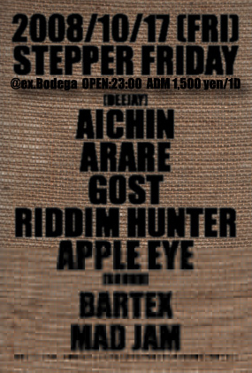 告知失礼致します。 2008/10/17(FRI) STEPPER FRIDAY OPEN 23:00 ADM 1,500/1D [DEEJAY] AICHIN ARARE GOST RIDDIM HUNTER APPLE EYE [SOUND] BARTEX MAD JAM ※深夜イベントの為、入場時にIDチェックがありますので、写真付きの身分証明書をご持参下さい。 cafe ex.Bodega 横浜市中区福富町仲通4-15国際ビルヂングB1 TEL&FAX:045-242-5553 http://www.ex-bodega.com