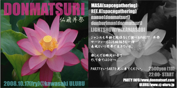 2008.10.17.fri 丼祭 vol.11 [〜仏飛び 原点回帰〜] @向ヶ丘遊園ULURU http://www.cj-uluru.jp/ 22:00open \2500(1D) DJ; MASA(宇宙集会) REE.K(宇宙集会) 7e DONBURIMAN 光の演出;ひかりあそび(shinkilow) MASA&Ree.kのロングセットに、 ShinkilowのARATAによる実験的なデコとライティングで、ちょっと宇宙へ小旅行.♪ 50/50waveskatesのサーフボード展示も。 物足りないとは絶対に言わせない! ヤバイ音で踊りたければ丼祭りへ! 確実に仏飛ばします。 サーファーもクラバーもアーティストもみんな一緒。 年齢も関係な