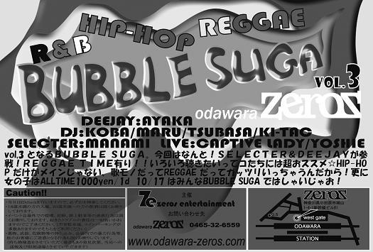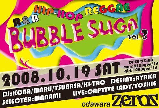 2008年10月17日(FRI) @odawara ZEROS −HIPHOP,R&B,REGGAE− OPEN / 23:00 Door / Man ¥2500(1D) Girl ¥1000(1D) ★☆★☆★☆★☆★☆★☆★☆★☆★☆★☆★☆★☆★☆★☆★☆★☆★☆★☆★☆★☆ vol.3となるBUBBLE SUGA。今回は、なんとSELECTER&DEEJAYが加わり REGGAEの時間もあります。 いろいろ聴きたいってコたちには超オススメ! HIP-HOPだけがメインじゃない。歌モノだって、REGGAEだってガッツリいっちゃうんだから! さらに、女の