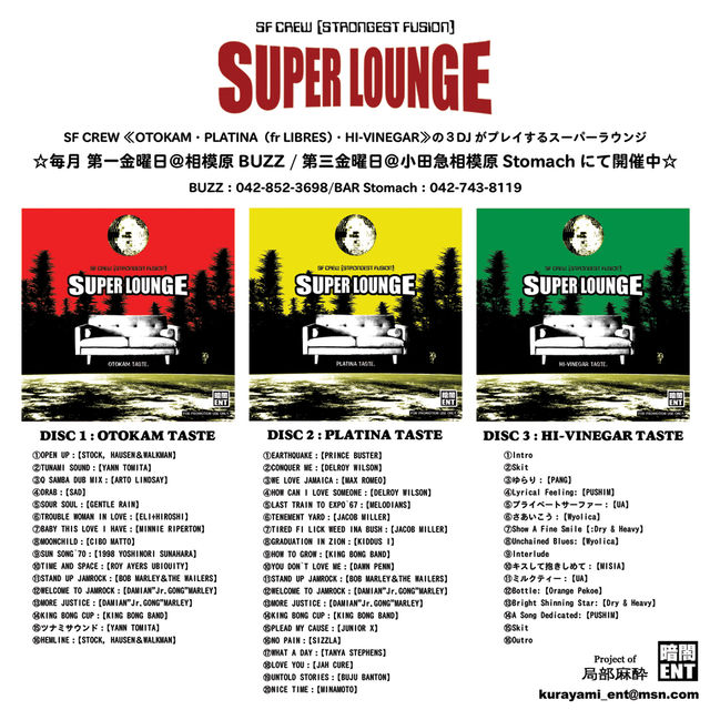 管理人さま告知協力願います。 ≪SF CREW presents / SUPER LOUNGE ≫ ■2008.10.03 FRI 9時スタート ■本日の開催地は小田急相模原STOMACH!! ■入場無料!! ■出演 ≫【SF CREW(STORONGEST FUSION)】 ≫OTOKAM fr Stomach sound http://mixi.jp/view_community.pl?id=998814 ≫PLATINA fr LIBRES http://mixi.jp/view_community.pl?id=637935 ≫HI-VINEGAR fr 闇アガリ http://mixi.jp/view_community.pl?id=135251 多くの音楽を網羅した多ジャンル集団、 【SF CREW】主催の入場無料のフリーラウ