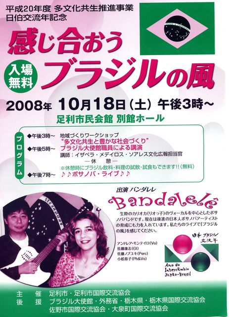 足利市でブラジルイベントです!お近くの方は是非ご参加お願いしまっす! 無料でブラジル料理などの試食も出来ますよ。 平成20年度 多文化共生推進事業 日伯交流年記念 「感じ合おう ブラジルの風」 2008年10月18日(土)午後3時〜 足利市民会館 別館ホール 入場無料 午後3時〜 地域づくりワークショップ 「多文化共生と豊かな社会づくり」 午後5時〜 ブラジル大使館職員による講演 講師:イザベラ・メデイロス・ソアレス文化広報担当官 ※休憩時にブラジル飲料・料理の試飲・試食も出来ます!(無料) 午後7時〜