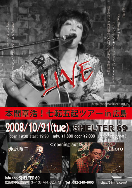 「本間章浩!七転五起ツアーin広島」 日時■10月21日(火) 場所■SHELTER 69 広島市中区銀山町13-13 シャトレ3ビル 5F TEL/082-248-4005 http://www.69mfc.com/ 開場■19:00 開演■19:30 前売■\1,800(要1ドリンク) 当日■\2,000(要1ドリンク) 《出演》 ○本間章浩 ○永沢竜二 ○Choro ※日本のイギー&ストゥージズ!【赤と黒】をはじめ、【King Biscuit Time】【イジワルケイ★オールスターズ】等、様々なバンドで活躍中の日本ロック界屈指のCRAZY GUITARIST!本間章浩! 初のアコースティックソ