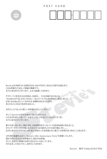 Stevie'sは1998年10/23開店以来、 おかげさまで、まもなく10周年を迎えます。 これも皆様のご来店、ご愛顧の賜物です。 本当にありがとうございます。 心から感謝しております。 サラリーマン時代からDJを始め、 1998年、一生DJを続けるためには、 「SoulBarをするしかないかなぁー」なんていう、 のんきな理由で、開店しました。 以来、SoulBarをしていなければ、 経験出来なかった事や、 多くの方々に出会う事が出来ました。 10年たった今も、日々新しいお客様と出会っています。 そして、Stevie'sの存在を初めて知ったあなた