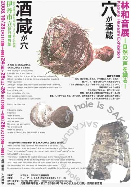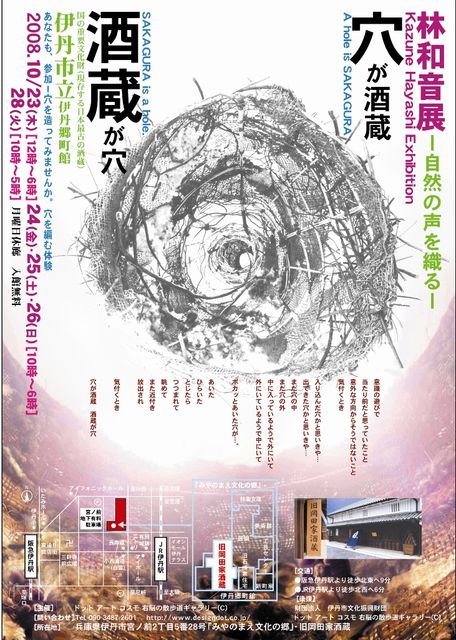 告知させていただきます。 「穴が酒蔵 酒蔵が穴」 意識の遊びで 当たり前だと思っていたこと 意外な方向からそうではないこと 気付くとき 入り込んだ穴かと思いきや… 出てきた穴かと思いきや… まだ穴の中 まだ穴の外 中に入っているようで外にいて 外にいているようで中にいて ポカッとあいた穴が…。 あいた ひらいた とじたら つつまれて 眺めて また近付き 放出され 気付くとき 穴が酒蔵 酒蔵が穴 内容です 林 和音 展 Kazune Hayashi Exhibition -自然の声を綴る-「