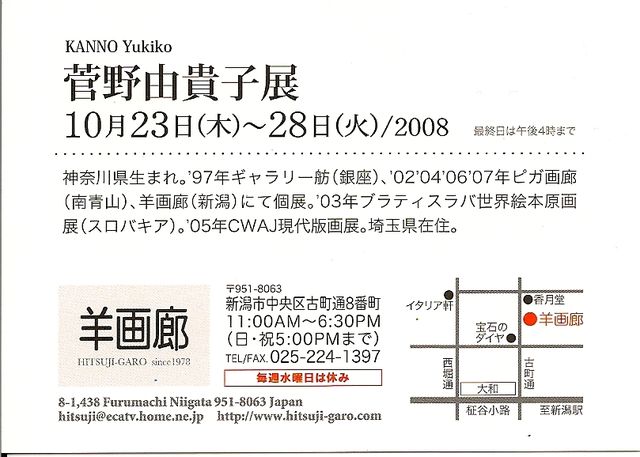 隔年でやってる新潟での個展です。 見に来てください <菅野由貴子展> 10月23日(木)〜28日(火)/2008 時間/11:00am〜6:30pm (日・祝 5:00pm) 羊画廊 〒951−8063 新潟市中央区古町通8番町 tel&fax 025−224−1397 http://www.hitsuji-garo.com