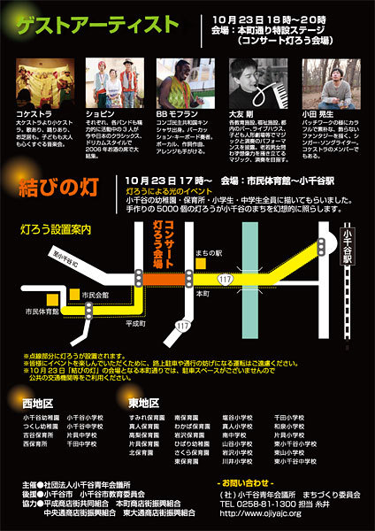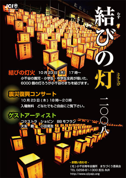 2004年の中越地震で被害の大きかった小千谷市で チャリティーコンサートがあります チャリティーですので、もちろん無料! 当日は小千谷の園児・小学生・中学生全員が描いた 6000個もの灯ろうが町を照らします ◇出演◇ ショピン(タカハシペチカ×野々歩×田中馨) B.B.モフラン 大友 剛 小田晃生 県内や近県にお住まいの方はもちろん 木曜空いてるよ!という方も是非いらしてください http://ojiya.tummy-magnet.com/ 以下、去年もコケストラとして出演したショピンの野々歩から ───────────