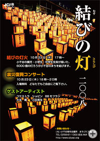 2004年の中越地震で被害の大きかった小千谷市で チャリティーコンサートがあります チャリティーですので、もちろん無料! 当日は小千谷の園児・小学生・中学生全員が描いた 6000個もの灯ろうが町を照らします ◇出演◇ ショピン(タカハシペチカ×野々歩×田中馨) B.B.モフラン(ハマケンの口から聞いたことがある名前…) 大友 剛 小田晃生 県内や近県にお住まいの方はもちろん 木曜空いてるよ!という方も是非いらしてください http://ojiya.tummy-magnet.com/ 以下、去年もコケストラとして出演したショピンの野々歩