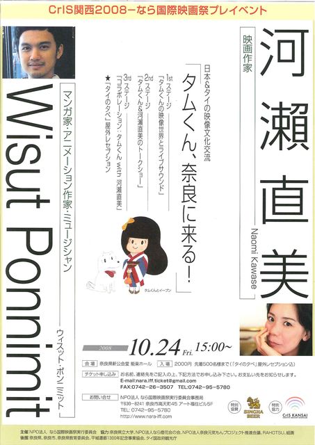 なら国際映画祭 第二回シンポジウム開催 2008/10/24 まもなく開催!! 2008年10月24日(金) CrIS関西2008-なら国際映画祭プレイベント @奈良県新公会堂能楽ホール 「タムくん、奈良に来る!」 1st Stage タムくんの映像世界とライブサウンド 2nd Stage タムくん&河瀬直美のトークショー 3rd Stage コラボレーション:タムくん on Keyboard w/ Imagery by 河瀬直美 入場:\2,000 (※タイの夕べ 野外レセプション込み) チケット申し込み:E-mail nara.iff.ticket@gmail.com Fax 0742-26-3507 Phone 0742-95-5780 For