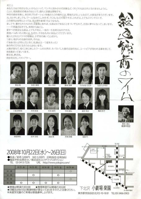 我らがたくみんこと木村拓海くんが芝居に出演します。 彼が所属するヨコザワプロダクションプロデュース公演「絵画館前のワーム」です。 絵画館前は、神宮の森を背景に虫たちの国立野外劇場?のようなもの。 太陽が落ちて、暗くじめじめしたワームの世界が、 ネバネバした銀の足跡の先にユートピアが現れる事を信じて、 夜毎集まってまいります。 夢芝居。夢芝居。 奇妙奇天烈、メタシアター。 「絵画館前のワーム」公演日程 10/22(水) 19:00〜 10/23(木) 14:00〜、19:00〜 10/24(金) 19:00〜 10/25(土) 14:00〜、19:00