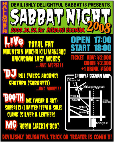 恒例の『SABBATNIGHT』の時期です☆ HPから大分遅れての更新ですが今年も音楽とアートとお酒で楽しい時間を過ごしちゃいましょう☆ ◆日時:2008年10月25日(土) ◆OPEN:17:00 / START:18:00 ◆会場:渋谷eggman ◆TICKET:前売り¥2,000(+DRINK \500) 当日¥2,300(+DRINK \500) ◆LIVE◆ ・TOTAL FAT ・MOUNTAIN MOCHA KILIMAJARO ・unknoun last words ・UPLIFT SPICE ◆DJ◆ ・RUI (MESS AROUND/札幌) ・Shotaro (SABBAT13) ◆MC◆ ・Horio (Jackin' Box) ◆BOOTH◆ ・INC(WEAR