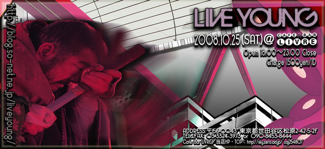 速報でございます。 色んな刺激を貰ってますんで、自分でも。 LIVE YOUNG 〜Omission husk of summer〜(夏の抜け殻) 10月25日(土) OPEN 17:00 START 17:00 END 23:00 @明大前駅 CAFE BAR LIVRE ¥1500(1drink) ★18歳以下は、NO CHARGE&NO ALCOHOL ★22歳以下は、¥1000(with 1drink) (※学生証など、身分証をお持ちください) 【SELECTER】 17:00-17:35 ゆかちん(from MIX JUICE) 17:35-17:55 MADSAKAZ (from discomachine)