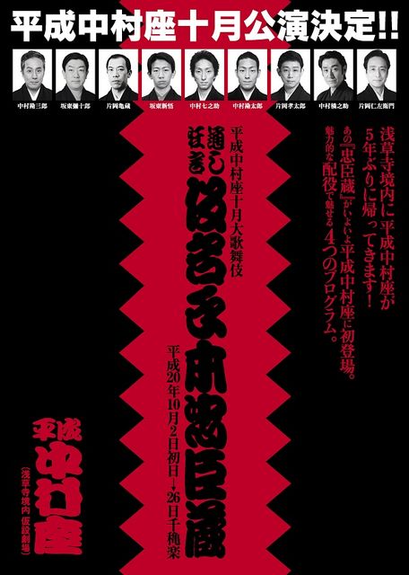従来は「芝居総見の会」でご案内していましたが、 今回はこの中村屋のコミュでご案内いたします。 中村屋の芝居は千秋楽のハプニングが、ひとつの大きな呼び物になっています。 僥倖にも、今回も10月26日(日)16;45の「Bプロ」プラティナティケッツが若干枚用意できました(1枚はあたいの分ですが) いずれも1等席(14700円)ですが、いらっしゃりたい方は、こちらにその旨お書き込みくださいまし。応募者が多い場合は、抽選にさせていただきますね。 平成中村座十月大歌舞伎 通し狂言仮名手本忠臣蔵 平成20年10月2日(木)〜