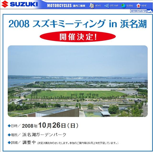 去年も大好評のうちに終わりましたスズキミーティングin浜名湖 買い物・イベント・そしてTFWの仲間とイベント尽くしでした。 今年もあの感動を再び!(って大げさですが)浜名湖で会いましょう。 関西・関東の中間地点なので皆さんちょっと距離はありますが、がんばって行って見ませんか? 日時と場所しかまだスズキのほうでも決まっていませんが、盛り上がっている今のうちにとっととトピック立てちゃいましょう。 年1回の統一イベントたくさん集まって、語って楽しい時間をすごしましょう! 久々の団長イベントでも有ります。 私も