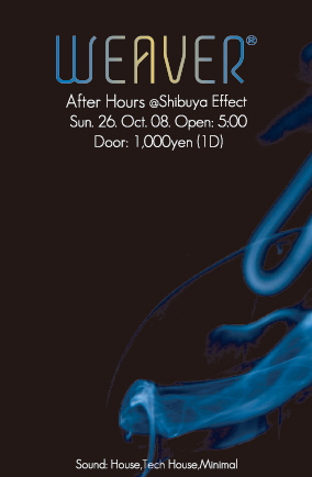 土曜日の夜では遊び足りない人達へ。 クオリティー・ミュージックを追求するWEAVERが送る、 アバンギャルドなアフターアワーズ・パーティー! WEAVER AFTER HOURS Date: Sunday morning 26.10.08 start 5:00 till 11:00 Door:\1,000(1D) DJs: Kentaro Hasegawa (Sequence Pulse) Yoshitaca (mirage, Hype Muzik) Naoshi Osamu Sound: House, Tech House, Minimal Venue: 渋谷 EFFECT 03-3770-7729 http://www.shibuya-effect.com Releasing info: Yoshitaca - New EP "Duzzled" Hype Muzik