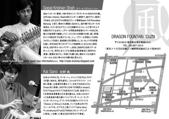 “風” @Dragon Fountain 'Cuzn 本場インドで注目の若手シタール奏者 Gopal Krishan shah と  ここ日本で注目の若手タブラ奏者 佐野塊 の初競演。 日印両国の新世代の演奏家によるインド古典音楽。 即興で演奏されるインド古典ならではの、 今、この瞬間に生まれるその風を 肌で感じてください。 10月26日 open 18:00 start 19:00 会場 DRAGON FOUNTAIN 'CUZN (東京メトロ日比谷線三ノ輪駅明治通出口より徒歩6分) 〒110-0012 東京都台東区竜泉3-6-5 TEL : 03-3871-0214 FAX:03-3871-0193 http://ww