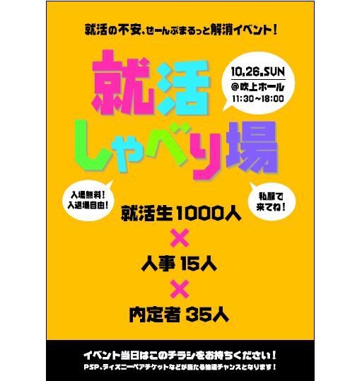 衝撃衝撃衝撃学生が企業と一緒に作った就活イベント衝撃衝撃衝撃 るんるん10月26日(日)11:30−18:00るんるん 自転車IN 吹上ホール 第1ファッション展示場走る人 双子座名古屋市営地下鉄桜通線バス吹上駅?番出口双子座 次に内容を ・内定者の先輩の相談コーナーえんぴつ ・参加企業は15社目がハート人事も15名富士山 ・就活に役立つグッド(上向き矢印)ブースも盛りだくさんひよこ 衝撃以下に、参加企業情報衝撃 ◆三菱東京UFJ銀行 ◆JTB中部 ◆豊島 ◆オンワード樫山 ◆名古屋観光ホテル ◆旭化成