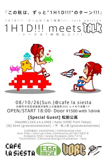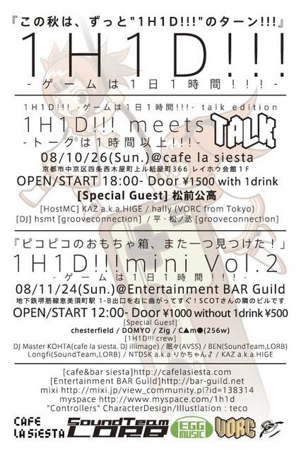 ////////////////////////////////////////////////// 1H1D!!!-ゲームは一日一時間!!!- talk edition 「1H1D!!! - meets TALK 〜トークは一時間以上!!!〜」 ■10月26日(日)18:00-22:30 charge 1500yen w/1D ////////////////////////////////////////////////// [Guest] 松前公高 [HostMC] Kaz a.k.a.HIGE hally (VORC from Tokyo) [DJ] hsmt [grooveconnection] 平・松ノ丞 [grooveconnection] and more... ////////////////////////////////////////////////// KONAMI矩形波倶楽部、TAITO Zuntata、SEGA S.S.T. BA