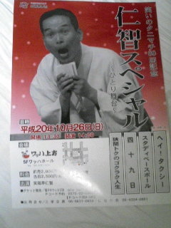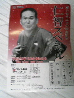この10月に、「笑いのタニマチ」が80回目を迎えるとのことで、いつもの会場を飛び出して ワッハホールで、しかも日曜の昼に、なおかつ仁智師匠が一人で4席つとめるという会が 開催されます。 発表されているネタは、以下の4つです。 「ヘイ!タクシー!」 「スタディベースボール」 「四十九日」 「狭間トクのゴクラク人生」 前売りは、8月28日(書いている今日です)からで、チケットぴあでも購入可能です。 Pコード:389−540 仁智師匠出演の会等でも、販売されると思われます。 前売り価格:2,000円(当日2,