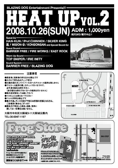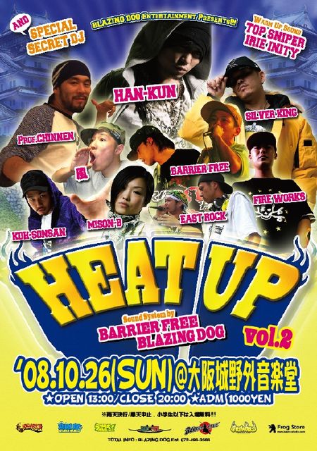 管理人様告知失礼します。 BLAZING DOG Entertainment Presents!!! 『HEAT UP vol.2』 ■2008/10/26[SUN] ■@大阪城野外音楽堂 ■OPEN 13:00 / CLOSE 20:00 (雨天決行/悪天中止) ■ADM 1,000yen 当日券のみ(小学生以下は入場無料) -Guest Dj- HAN-KUN Prof.CHINNEN SILVER KING MISON-B KOH-SONSAN Special Secret DJ -Guest Sound- BARRIER FREE FIRE WORKS EAST ROCK -Warm Up Sound- TOP SNIPER IRIE INITY -Sound System- BARRIER FREE BLAZING DOG       -注意事項-