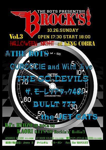 ★日本が誇る、伝説のパンカビリー「the BOTS」からの最高のロックンロールショウ『B Rock's』も、今回で早くも三回目となりました。 〜the BOTS presents!!!〜 『B Rock's』 vol.3 HALLOWEEN NIGT! 10月26(日) @大阪・心斎橋 アメリカ村三角公園前 KING COBRA http://king-cobra.net/osaka 17:30  OPEN 18:00  START  前売り2500(ドリンク代別)当日3000(ドリンク代別)      限定ペアチケット4000(ドリンク代別)   出演バンド ★the BOTS ★CUBOCCIE and "Wild Jive"