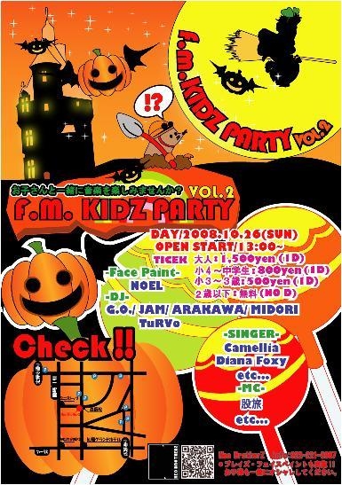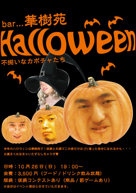 はい、みなさん! ごきげんよう!! 今年も この時期がやってきましたよ。 毎年恒例のイベント。 ハロウィンパーティーの告知をさせていただきます。 もう説明はいらないかもしれませんが 日頃と違う衣装を着たりして 仮装して楽しく遊びましょう!のパーティーです ・59’S HALLOWEEN PARTY 2008    10月26日(SUN)   START 19:00〜24:00           {説明}・・・ハロウィンとは!? 基本的には オバケが来るぞー、お菓子もらうぞー 的な