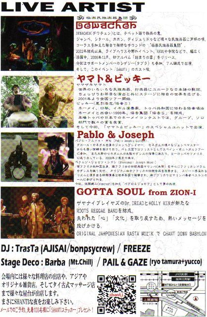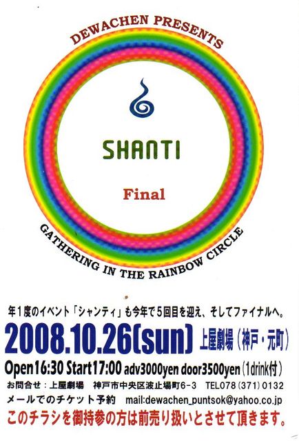 今年の夏に「FREE TIBET FREE LIVE」を企画したDEWACHEN主催の恒例イベント 「SHANTI」  日時 10月26日(日)OPEN 16:30 START 17:00 場所 神戸 元町 上屋劇場(078-371-0123) adv 3000yen door3500yen(1drink付)   毎年10月の最終日曜日に開催していた DEWACHEN PRESENTS 「SHANTI」も、お蔭様で5回目を迎えます。 そして、今回でFinal… 5年の集大成イベントになりました。 LIVE DEWACHEN ヤマト&ビッキー PABLO & JOSEPH GOTTA SOUL from ZION-I DJ TrasTa(AJISAI/bonpsycrew)