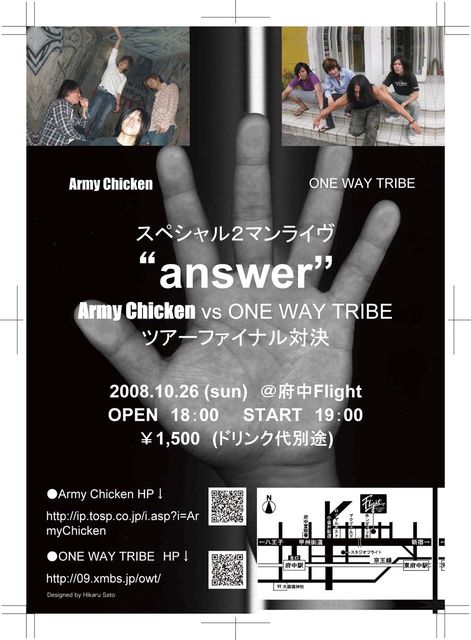 OPEN 18:00 START 19:00 ADV: \1500+D act: Army Chicken/ONE WAY TRIBE です。Army Chickenはトップで出ます! この日は2バンドのツアーファイナルになるので、2バンドとも気合が入ってます。 いい日になりますよ!! みんな遊びにいらっしゃい!!!!!!