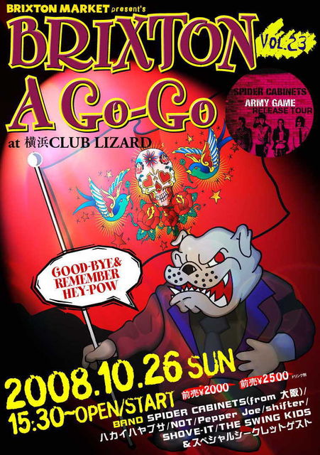 【Brixton A GO-GO vol,23】 SPIDER CABINETS ARMY GAME RELEASE TOUR GOOD-BYE&REMEMBER HEY-POW 2008.10.26(SUN) 横浜CLUB LIZARD OPEN/START 15:30 TICKET 前売り2000/当日2500(共にD別) 【BAND】 ハカイハヤブサ http://www.hakaihayabusa.com/information/ NOT http://www.geocities.jp/notcrue/ Pepper Joe http://ip.tosp.co.jp/i.asp?I=pepperjoe shifter http://www.samuraifactory.com/shifter/ SHOVE-IT http://ip.tosp.co.jp/i.asp?I=ALL03 SPIDER CABINETS http://www.spider-cabinets.net/ THE SWING KIDS h