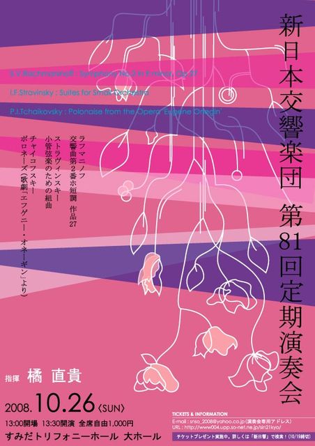 第81回定期演奏会 会場:すみだトリフォニーホール 開場:13時00分 開演:13時30分 指揮:橘直貴先生 曲目:チャイコフスキー:歌劇「エフゲニーオネーギン」より「ポロネーズ」    ストラヴィンスキー:小管弦楽のための組曲第1番・第2番    ラフマニノフ:交響曲第2番ホ短調作品27