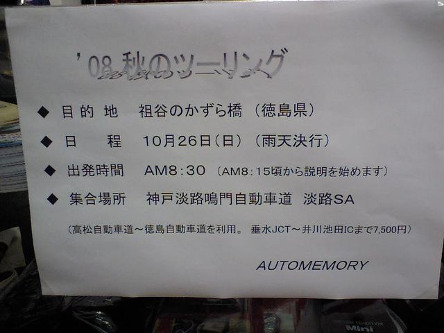 オートメモリー秋のツーリングが発表されました 目的地 徳島県 祖谷のかずら橋 日時 10月26日(日) 雨天決行     AM08:30出発(08:15頃には点呼・説明が始まります) 集合場所 淡路サービスエリア下り 高速料金 垂水JCT〜井川池田ICまで7500円 まだ詳しいプランは発表されていませんが、皆様準備万端(主に徳島ラーメンマップ&ラーメン用腹(違)で参加いたしましょうw オートメモリーサイトトップにて後々詳しく発表されるでしょう http://www.automemory.co.jp/