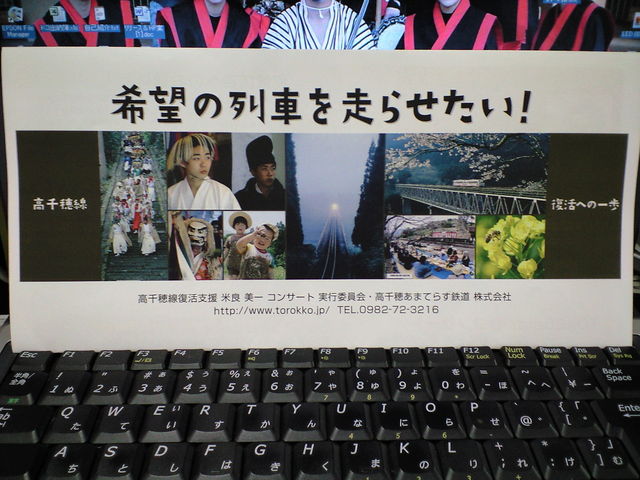 希望の列車を走らせたい! 高千穂線復活支援 『米良美一コンサート』 が開催されます! 10月25日(土) ●前夜祭 時間:15時〜20時 場所:高千穂駅周辺 内容:街角音楽祭    高千穂エイサーシンカゆい afro blue のストリートパフォーマンス    高千穂線の話(語り手:斉藤元高千穂線運転士)    写真家藤木哲朗氏高千穂の風景スライドショー    各団体出店 10月26日(日) ●コンサート 時間:15時30分〜18時45分 場所:高千穂駅裏棚田特設会場 開演:第一部16:30〜17:30