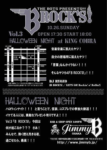 あと1ヶ月と迫ってきました!!! HALLOWEEN SPECIALとゆ〜ことで、 どんどん仮装・コスプレ・変装?してきて下さいねるんるん イカした方にはなんかプレゼントがあるそうで衝撃 皆さんまた一緒にGOOD TIME過ごしましょう〜〜ぴかぴか(新しい) 〜the BOTS presents!!!〜 『B Rock's!』 vol.3 HALLOWEEN NIGT! 10月26(日) @大阪・心斎橋 アメリカ村三角公園前 KING COBRA http://king-cobra.net/osaka 17:30  OPEN 18:00  START  前売り\2500(ドリンク代別)当日 \3000(ドリンク代別) 限定ペアチケット\40