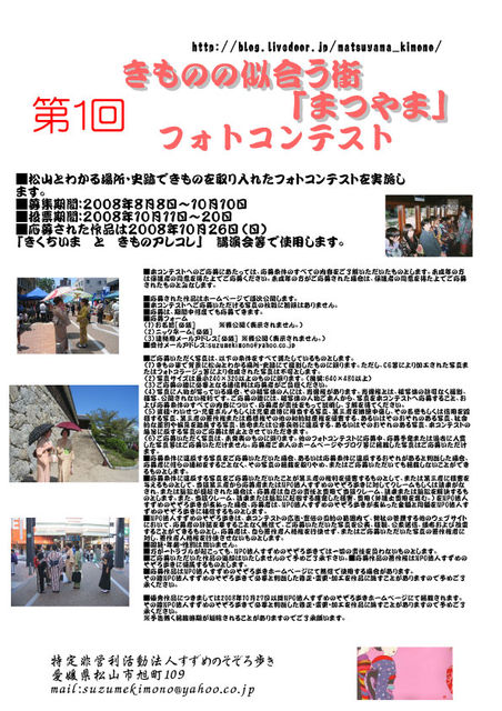 ■松山とわかる場所・史跡できものを取り入れたフォトコンテストを実施します。 ■募集期間:2008年8月8日〜10月10日 ■投票期間:2008年10月11日〜20日 ■応募された作品は2008年10月26日(日)「きくちいま と きものアレコレ」 講演会等で使用します。 http://blog.livedoor.jp/matsuyama_kimono/ ブログを見てください。 応募方法を説明いたします。 ■募集期間:2008年8月8日〜10月10日 1.応募条件をよく読んでください。 2.きものモデルを探す。もしくは自分でモデルになる