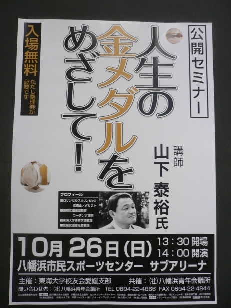 【公開セミナー】 10月26日(日) 八幡浜市民スポーツセンター サブアリーナ 開演14:00 入場無料(ただし整理券が必要です) 『人生の金メダルをめざして』 講師:山下泰裕 氏 プロフィール: ロス五輪柔道金メダリスト 東海大学体育学部教授 愛媛武道館名誉館長 あの柔道の山下さんの講演会が八幡浜で開催されます 入場は無料ですが整理券が必要です。 整理券はポスターの貼っている店舗 (八幡浜市・西予市・伊方町辺り)で、 『整理券あります!』