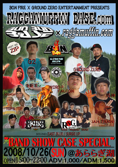 2008.10.26(Sun) BON FIRE × GROUND ZERO Ent. PRESENTS 『RAGGAMUFFIN BASE.com』 -BAND SHOW CASE SPECIAL- 岐阜飛騨 @あららぎ湖(野外) @Green park OPEN 15:00〜 <DEEJAY> G2 / HYDRO-P / 音斬草 / FALCON / GOEMON / 馬神 <SOUND> K.O.S MOVEMENT / TOP-O-TOP / GROUND ZERO / JAH-TRAIN / EAST BLUE / SURGE UP <RUB-A-DUB> 獅子丸 / KATOKIN / D.K and more… <BAND> R.N.G“Majestic”BAND <HOST MC> ZIP (前売)¥1,000 (当日)¥1,500 岐阜のDANCE [[BUN BUN BASE]と、 飛騨のDANCE [raggamuff