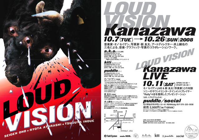 金沢アートプラットフォームの連携イベントの告知です。 ※管理人さん、おじゃまします。 もし内容が適切でなければ削除してください。 ーーーーーーーーーーーーーーーーーーーーーーーーー 「 LOUD VISION in Kanazawa」 SEIGEN ONO + RYOTA ATARASHI + TSUGUYA INOUE ーーーーーーーーーーーーーーーーーーーーーーーーー ■展覧会 井上嗣也(アートディレクター)、オノセイゲン(音楽家)、新良太 (写真家)の三名による、音楽・グラフィック・写真のコラボレーシ ョンワーク。 日時:10月7日(火)〜10月27日(