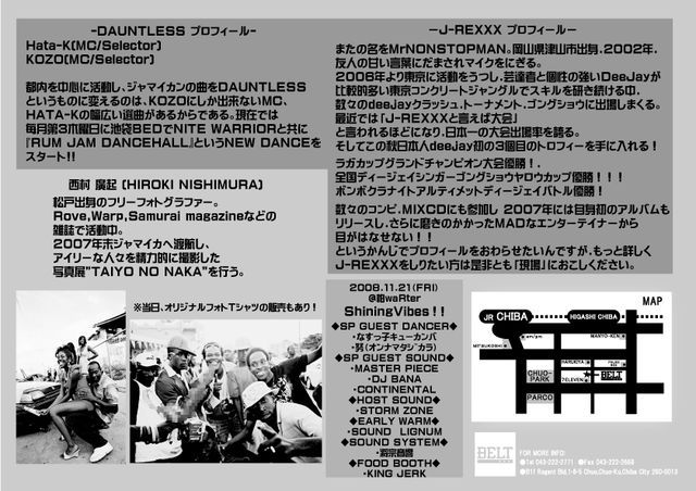 LEEの生バンドでのワンマンライブショウです! 最近やっていないクラブイベントでのソロライブ!フェスとは違い目の前で長い時間リーのステージが楽しめる滅多にないダンスです! DOBUITA DANCEHALL BASH vol.3 -dancehall band show- 2008/10/31(金)@CLUB PLANET yokosuka open 22:00 ADV \2500/1d DOOR \3000/1d band:RUDE FISH BAND artist:CHOZEN LEE from fire ball/RUEED/PAPA TENG sound:UNSTOPPABLE/ONE BLOOD/KANGCHENJANGA SOUND/UNBREAKABLE/REED RUN sound system:ZIONICS 前売り券はPLANETか横須賀中央駅目の前ALLROU