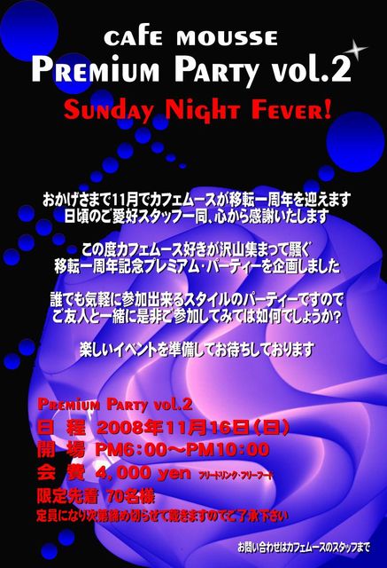 早いもので、11月で cafe mousseが移転1周年を迎える事になります。 おかげでスタッフ共々、人生の財産になる様な出会いばかりで、 本当に素敵な1年間だったと思います。 この場をお借りして皆様に心から感謝いたします。 さて、イベント好きなスタッフが揃った当グループとしましては 2周年の2009年2月まで待てないって話になりまして・・・ 2008年11月16日(日)に移転1周年を記念して、 コミュの皆さんや、知人友人などを多数集めた 本題【cafe mousse Premium praty Vol.2】 副題【Sunrday Night Fever!】を開催した